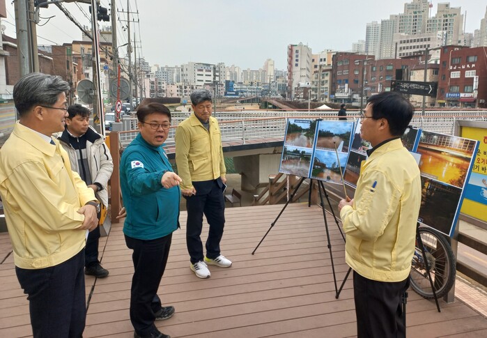 김동구 한강유역환경청장이 최근 서울 구로구와 경기 광명시에 위치한 목감천과 개봉1펌프장을 찾아 현장을 확인했다. 이날 김 청장은 목감천 저류지 설치 예정지 등을 방문하고, 개봉1펌프장의 운영현황 등을 점검하며 올해 홍수기 전까지 사전대비를 철저히 해줄 것을 당부했다. 사진은 김 청장(오른쪽 세 번째)이 목감천 개웅교를 찾아 현장점검을 하고 있는 모습. (사진=한강유역환경청 제공)