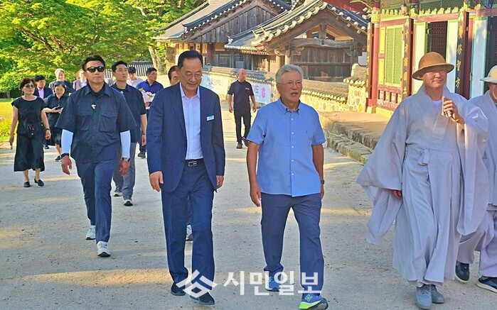 | ▲ 문제인 전 대통령이 해남대흥사를 방문해 명현관 해남군수, 대흥사 법상 주지스님 등과 천불전 앞을 지나고 있다./ 해남군 제공 |