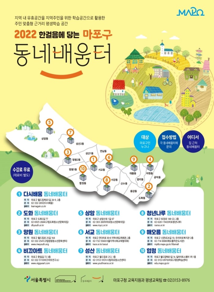 구는 올해 ▲합정 동네배움터(합정동, 마포구평생학습센터) ▲다시배움 동네배움터(서교동, 다시배움 교육원) 2곳을 동네 배움터로 신규 지정했고, 이에 총 10곳의 동네배움터에서 52개 프로그램과 10개 학습 실천 프로젝트가 진행된다.