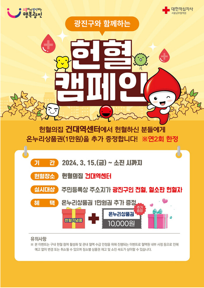 [시민일보 = 여영준 기자] 서울 광진구(구청장 김경호)는 안정적인 혈액 수급을 위해 '헌혈의 집 건대역센터'에서 헌혈에 참여한 구민에게 온누리상품권을 지원하고 있다고 밝혔다.