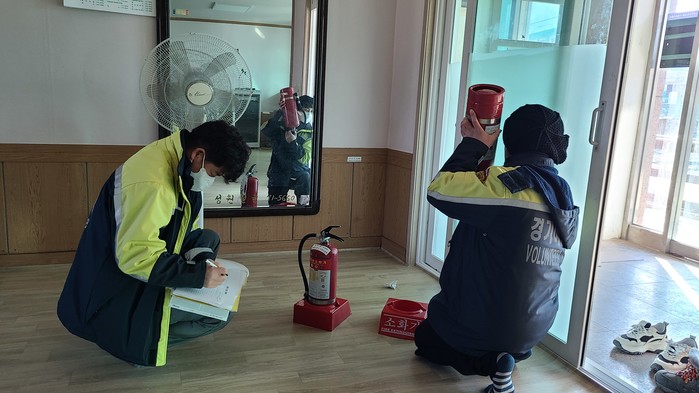 경기 양평군 지평면 남·여 의용소방대는 최근 소방활동 캠페인 활동 행사를 열고 지역내 30개리 마을회관을 순차 방문해 소화기 비치 등을 확인·점검하고 소화기 사용방법 등 안전교육 활동을 실시했다. 사진은 이날 소방대원들이 마을회관을 방문해 소화기를 확인하고 있는 모습. (사진제공=양평군청)