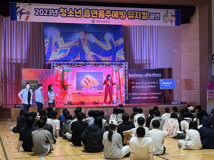 | ▲ 강진군보건소, 지난 14일 청람중학교를 시작으로 강진여자중학교, 강진중앙초등학교 청소년 대상 찾아가는 흡연·음주 예방 뮤지컬 공연 / 강진군 제공 |