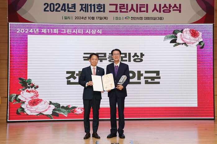 | ▲ 박우량 신안군수(우측)가 환경부에서 주관한 환경 관리에 모범을 보인 기초지자체 6곳 중 한 곳으로 선정되어 지난 17일(목) 천안시청에서 열린 2024년 ‘제11회 그린시티 시상식’에서 국무총리상을 수상했다. |