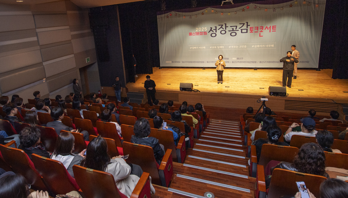 박희영 서울 용산구청장은 4일 용산아트홀 소극장 가람에서 열린 ‘성장공감 토크콘서트’에 참석해 어린이집 관계자 및 학부모들과 소통했다. 이날 행사에는 유아·어린이 교육과 가족 간 소통에 관심 있는 구민 200여명이 참여했다. 사진은 박희영 구청장이 인사말을 하고 있는 모습. (사진=용산구청 제공)