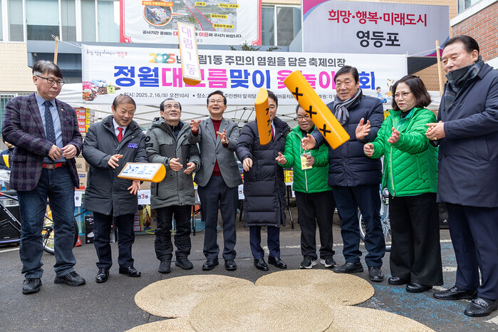 16일 영등포구 대림1동 주민센터 앞마당에서 대림1동 정원대보름맞이 윷놀이대회가 열렸다. 사진은 행사에 참석한 최호권 구청장(왼쪽 네 번째)이 참석자들과 윷을 던지고 있는 모습. (사진=영등포구청 제공)