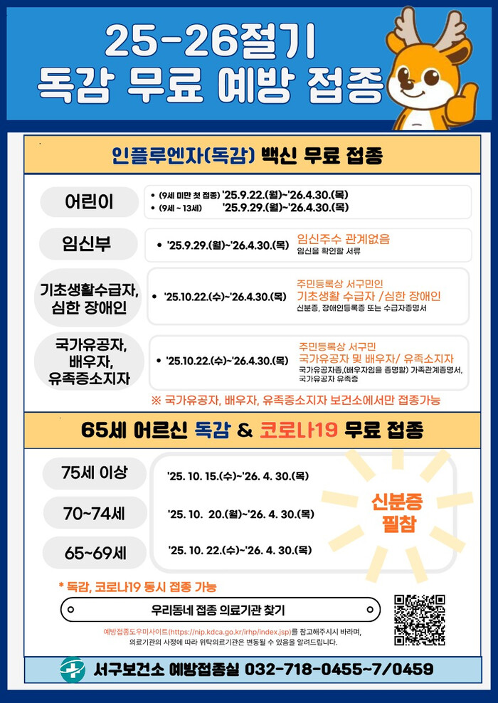 [인천=문찬식 기자] 인천 서구가 오는 22일부터 2025~2026절기 인플루엔자(독감) 무료 예방접종을 실시한다고 11일 밝혔다.