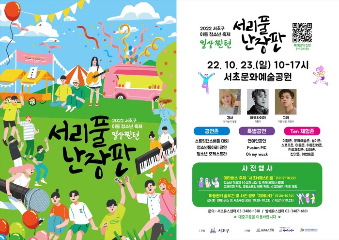 [시민일보 = 이대우 기자] 서울 서초구(구청장 전성수) 양재동 서초 문화예술공원에서 청소년 축제 ‘2022 서리풀 난장판’ 축제가 오는 23일 열린다.