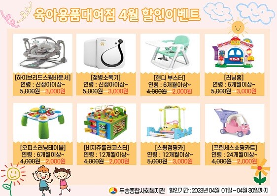 [부산=최성일 기자] 두송종합사회복지관(관장 김태형)은 ‘’사하구 다대2동 4지구BMC아파트 내 두송종합사회복지관 육아용품대여점 [아이꿈터]에서는 매월 대여료 반값 할인과 이용후기 작성 등 다양한 이벤트를 진행하고 있다‘’고전했다.
