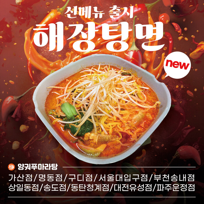 새롭게 선보이는 해장탕면은 몸에 좋은 각종 신선 채소와 고기를 양궈푸마라탕만의 깊고 진한 사골육수에 듬뿍 담아 끓여낸 별미 음식으로, 마라탕처럼 여러 재료를 직접 선택할 필요가 없다. 한 그릇에 고기, 야채, 면이 다 들어가 있어 직장인들의 점심 시간을 절약해 줄 푸짐하고 든든한 한 끼 메뉴로 기대가 모아진다.