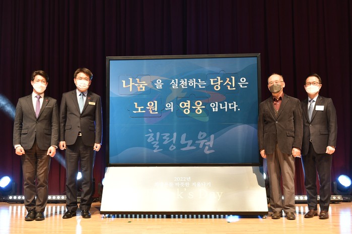 서울 노원구가 최근 '2022년 희망온돌 따뜻한 겨울나기 땡스 데이(Thank’s Day)' 행사를 진행했다. 땡스 데이는 지난 2월까지 3개월간 이웃돕기 모금에 참여한 기부자들에게 성과를 보고하고, 감사의 뜻을 전하기 위해 마련됐다. 사진은 이날 오승록 구청장(왼쪽 두 번째)과 관계자들이 기념촬영을 하는 모습. (사진제공=노원구청)