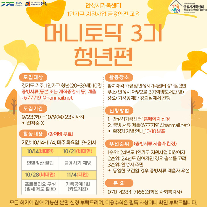[안성=오왕석 기자] 안성시가족센터는 1인 가구 청년층(20세~39세)을 대상으로 ‘금융안전 교육 – 머니토닥 3기’ 프로그램 참여자를 모집한다.
