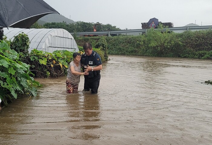 | ▲ 해남경찰서 소속 경찰관이 지난 21일 집중 호우로 주택이 침수돼 고립된 한 노약자를 구조하고 있다. / 해남경찰서 제공 |