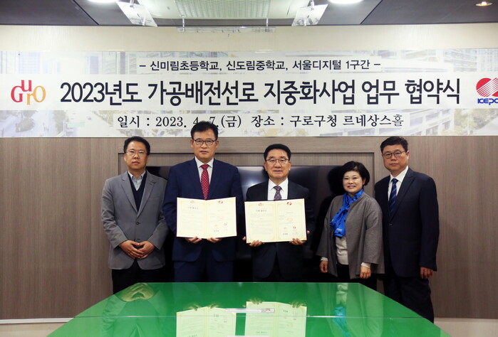 | ▲ 지난 7일 구로구청에서 ‘2023 그린뉴딜 지중화 사업’ 업무 협약식이 열렸다. 사진은 (오른쪽부터) 구로구 가로경관과 이미근 과장, 스마트환경국 김현숙 국장, 문헌일 구청장, 한국전력공사 설상문 구로금천지사장, 원거일 팀장이 협약 체결 후 기념촬영을 하고 있는 모습.(사진=구로구청 제공) |