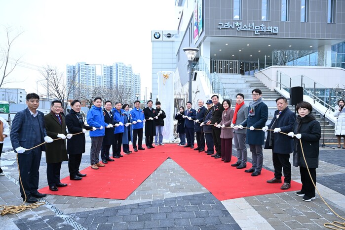 경기 구리시는 최근 ‘구리시 청소년 문화의 집’ 개관식을 개최했다. 구리시 청소년 문화의 집은 지하 1층~지상 5층 규모로 건립됐으며, 댄스룸·소모임실과 요리교실, 메타버스체험관 등 특성화 시설로 구성돼 청소년이 마음껏 활동할 수 있는 공간으로 활용될 예정이다. 사진은 개관식에서 백경현 시장(오른쪽 아홉 번째)과 관계자들이 제막식을 진행하고 있는 모습. (사진=구리시청 제공)