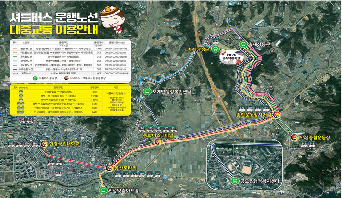 또한, 보개면 행정복지센터에서 축제장(동문)으로 가는 노선은 오전 9시 50분부터 오후 10시까지, 하루 40회가 운행되고, 새롭게 도입된 공도읍 노선은 오전 9시 20분부터 오후 10시까지 하루 60회 운행되며 공도읍 행정복지센터와 금호어울림 아파트, 부영아파트, 대림동산 입구, 중앙대 등을 경유해 축제장에 도착한다.