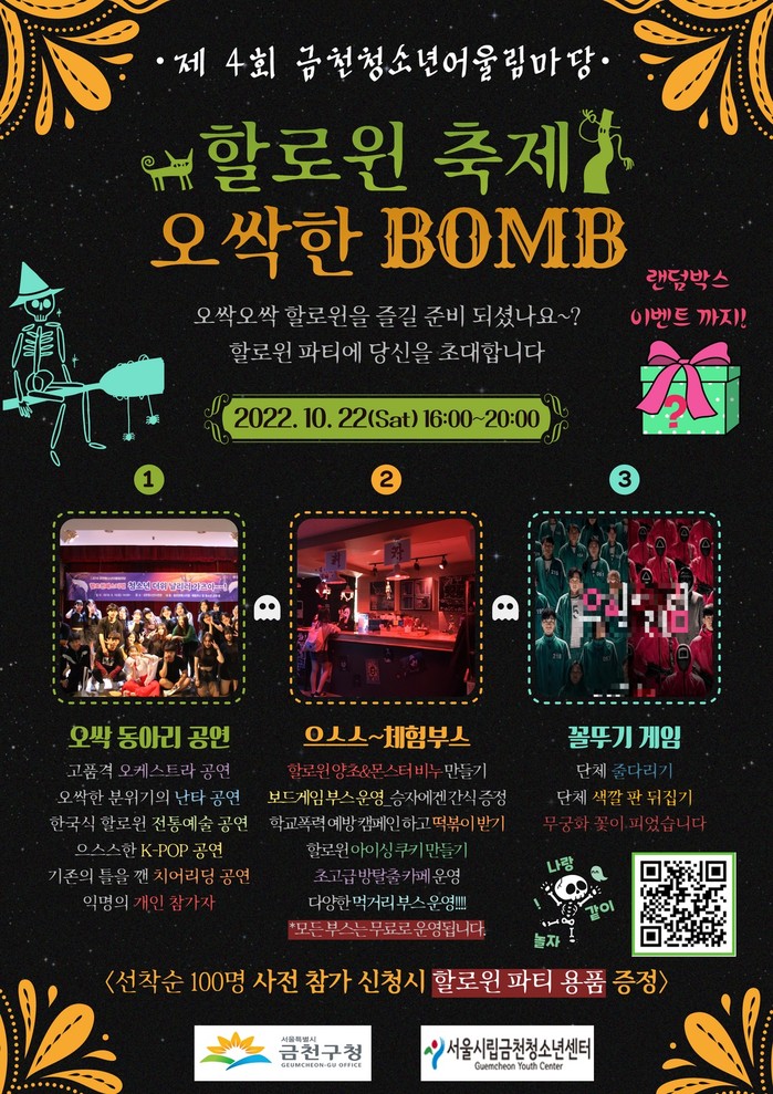 [시민일보 = 여영준 기자] 서울 금천구(구청장 유성훈)가 오는 22일 오후 4시 시립금천청소년센터에서 금천청소년어울림마당 핼러윈 축제 ‘오싹한 Bomb’을 개최한다.
