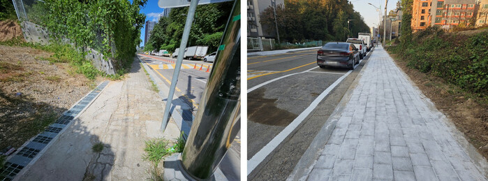 | ▲ 용인특례시 모현읍이 외대로 25번길 보행환경을 개선했다. 사진은 개선전(왼쪽)과 개선후(오른쪽) 모습. |