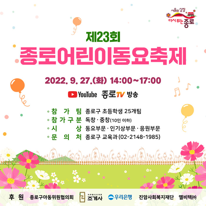 [시민일보 = 이대우 기자] 서울 종로구(구청장 정문헌)가 27일 오후 2시 종로TV 유튜브 채널에서 ‘종로 어린이 동요축제’를 중계한다.