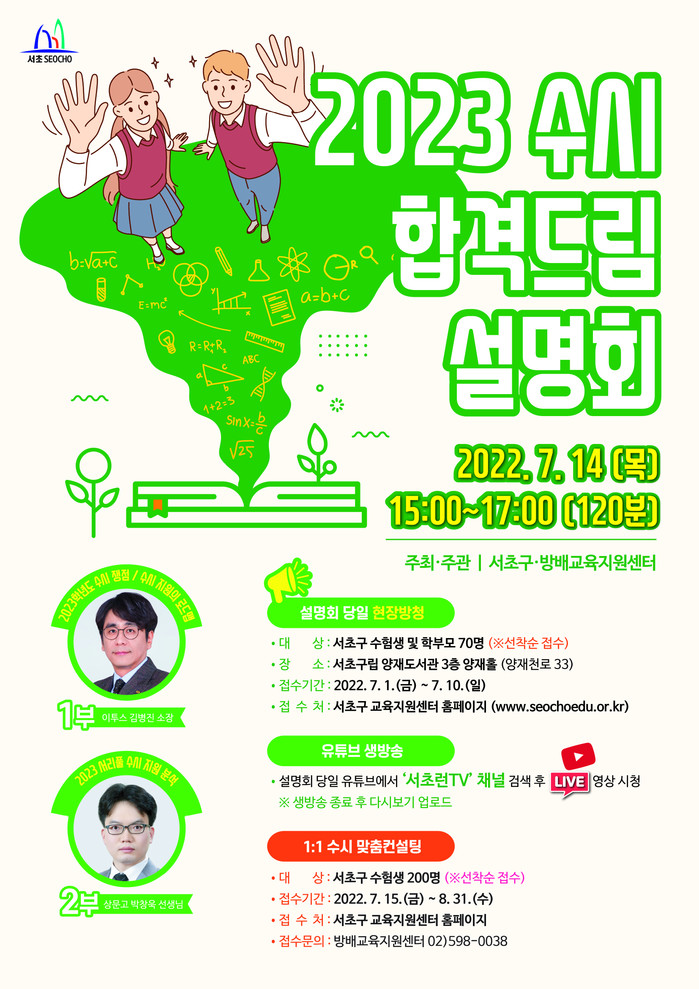 설명회 당일 현장방청은 수험생과 학부모 총 70명까지 선착순으로 접수받으며, 오는 10일까지 서초구 교육지원센터 홈페이지에서 신청할 수 있다. 현장방청 참석자에게는 2023 수시자료집, 전형정리표 등으로 구성된 수시합격 자료집도 제공한다.