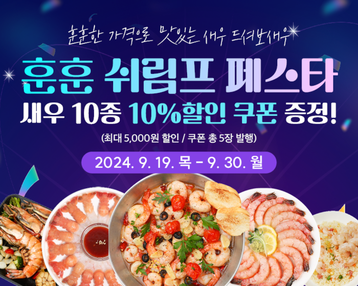 본행사는 9월 19일(목)부터 9월 30일(화)까지 진행되며, 새우 상품 구매 시 10% 할인 쿠폰을 지급한다.