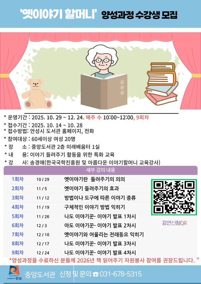 도서관 관계자는 “지역 어르신들이 삶의 지혜와 전통 이야기를 전하며 세대 간 소통의 다리를 놓는 뜻깊은 과정이 될 것이고 본 과정을 수료한 참여자들은 2026년 ‘책 읽어주기’ 자원봉사 프로그램에 참여할 수 있도록 안내할 계획이다.”라고 전했다.
