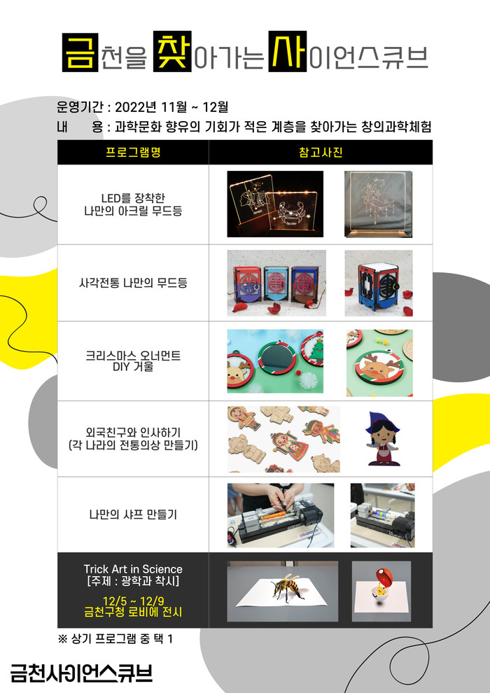 [시민일보 = 여영준 기자] 서울 금천구(구청장 유성훈)는 과학문화 향유 기회가 적은 계층을 직접 찾아가 창의과학 프로그램을 제공하는 ‘금천을 찾아가는 사이언스큐브(금찾사)’를 오는 12월9일까지 운영한다고 밝혔다.
