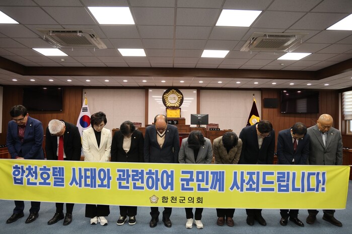 합천군의회는 사과문을 통해, “집행부를 견제하고 올바른 정책을 이끌지 못하여 부실하게 추진된 ‘합천영상테마파크 숙박시설 조성사업’을 바로잡지 못한 합천군의회의 책임론을 겸허히 받아들이며, 전 군민을 향해 사과드린다” 고 전하였다.