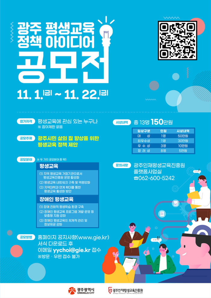 이춘문 광주인재평생교육진흥원장은 “이번 공모전은 민선 8기 평생교육 관련 공약사업을 수요자 중심으로 실현하기 위해 마련됐다”며 “앞으로도 진흥원은 시민의 삶과 배움을 잇는 가교 역할을 충실히 수행하겠다”고 말했다.