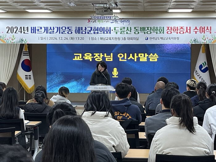 이자영 해남교육청 교육장은 “해남 지역 학생들을 위해 장학금을 전달한 바르게살기운동 해남군 협의회와 두륜산 동백 장학회에 감사의 인사를 전한다”며, “이렇게 학생들을 사랑하는 마음을 본받아 우리 학생들이 해남 지역의 자랑스러운 인재로 성장하길 바란다”고 말했다.