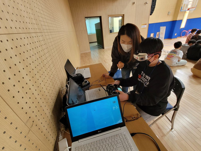 드론 실습반의 경우 ▲드론 조종법 설명 등의 이론수업 ▲일반 드론 조종체험 ▲고글을 착용하는 드론 시뮬레이터 조종 등 체험 위주 수업으로 구성됐다.