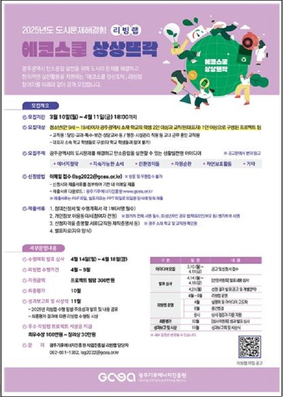 광주기후에너지진흥원 고상연 원장은 “에코스쿨 상상뜨락을 통해 미래 세대들이 도시문제 해결에 직접 참여해 탄소중립 사회의 주역으로 성장하고, 지역 사회의 지속가능한 발전에 기여할 수 있기를 기대한다”며 “많은 학생들의 적극적인 참여를 바란다”고 말했다.