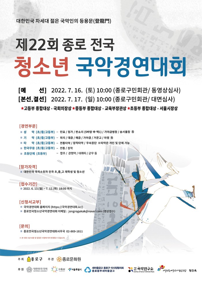 [시민일보 = 이대우 기자] 서울 종로구(구청장 정문헌)가 전통문화예술 계승·발전 이바지와 우리소리의 명맥을 이을 국악 대들보 발굴을 위해 ‘제22회 종로 전국 청소년 국악경연대회’를 개최한다.