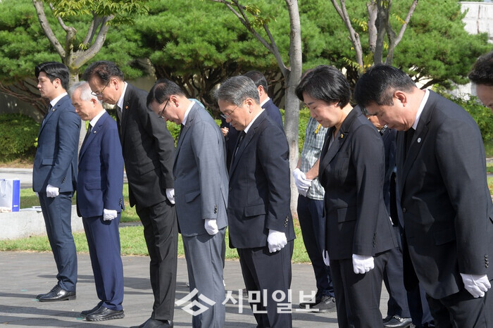 강기정 시장은 경축식에 앞서 상무시민공원에서 열린 참전기념탑 예정부지 지정 기념행사에 참석했다. 이어 광주독립운동기념탑에서 참배하고 희생자들을 기렸다.