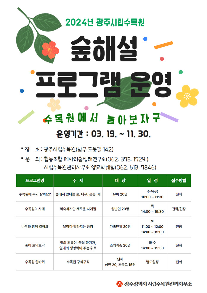 서명하 시립수목원관리사무소장은 “숲해설 프로그램을 일반 시민은 물론 노약자, 장애인 등 취약계층도 참여할 수 있도록 준비했다”며 “광주시민 누구나 숲을 배우고 즐길 수 있는 다양한 프로그램을 개발·운영, 도심 속 힐링공간이 되도록 노력하겠다”고 말했다.