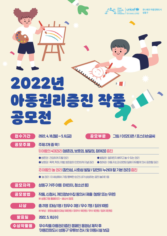 [시민일보 = 홍덕표 기자] 서울 성동구(구청장 정원오)가 가정의 달 5월을 맞아 아동의 권리가 존중되는 '아동친화도시 성동구' 조성을 위해 오는 5월6일까지 지역내 아동들이 참여하는 '2022년 아동권리증진 작품 공모전'을 개최한다.