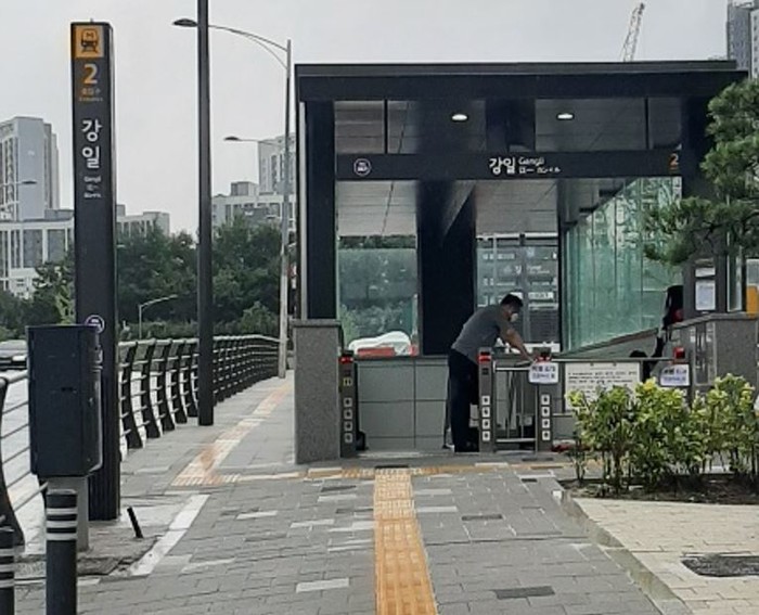 10일 구에 따르면 강일역 2번 출입구는 차량기지와 운행노선을 연결하는 입·출고선과 정거장 환기구 구조물 간섭을 해결하기 위한 안전공사 시행으로 지난해 3월 개통된 1, 3, 4번 출입구와 달리 이용이 불가했다.