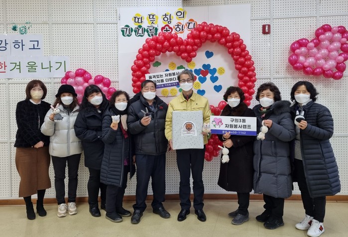 광진구 구의3동 자원봉사캠프 오싹봉사단이 최근 바느질 재능기부를 통해 만든 ‘양말 애착인형’ 60여개를 동주민센터에 전달했다. 이 인형은 아동의 출생신고를 위해 동주민센터에 방문하는 구민들에게 제공될 예정이다. 사진은 관계자들이 기념촬영을 하는 모습. (사진제공=광진구청)