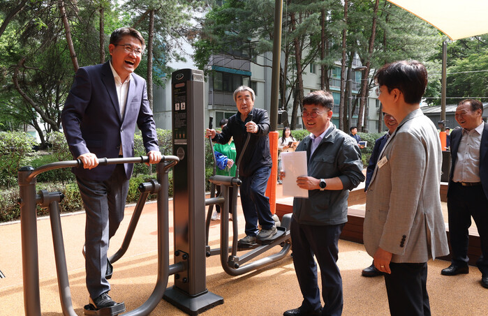 오승록 노원구청장이 19일 상계동 737-3 기린어린이공원에서 진행된 기린어린이공원 시설개선 준공식에 참석했다. 기린어린이공원은 지난 2월부터 약 3개월간 공원 리모델링에 착수해 기존 조합놀이대를 교체하고 고무칩 포장을 정비했으며, 영유아 놀이시설을 추가로 확충했다. 사진은 준공식에서 오 구청장이 시설을 이용하는 모습. (사진=노원구청 제공)