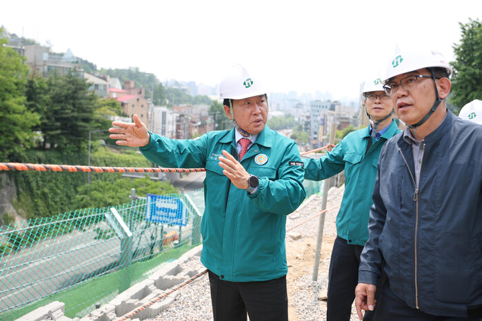 | ▲ 이성헌 구청장(왼쪽)이 28일 금화터널 인근 도로개설공사 현장을 찾아 여름철 집중호우에 대비한 안전 점검을 실시하고 있다. (사진=서대문구청 제공) |