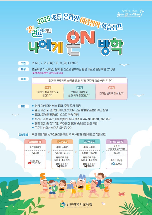 [인천=문찬식 기자] 인천광역시교육청(교육감 도성훈)은 여름방학을 맞아 초등학생 대상 자기주도 학습 프로그램 ‘읽걷쓰, 나에게 온(ON) 방학’을 운영한다고 10일 밝혔다.