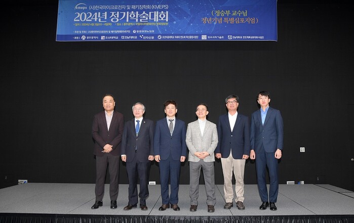 | ▲ 이상갑 광주시문화경제부시장이 3일 오전 국립아시아문화전당에서 열린 ‘2024년 한국마이크로전자 및 패키징 춘계학술대회’ 개막식에 참석해 환영사를 한 후 참석자들과 함께 기념촬영을 하고 있다. /광주광역시 제공 |