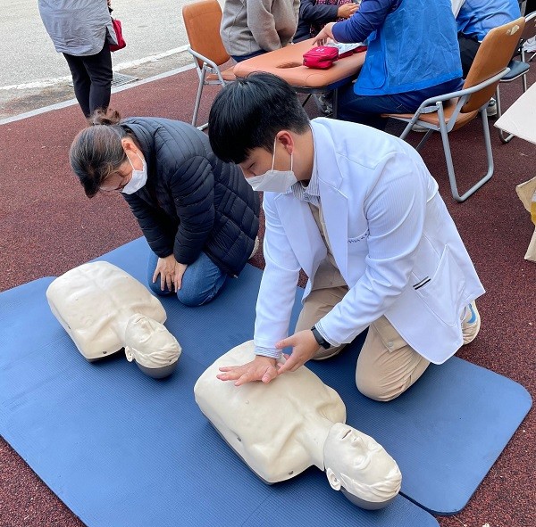 | ▲ < CPR 교육을 진행하고 있는 보건의료통합봉사회 이은우 응급구조사 > |