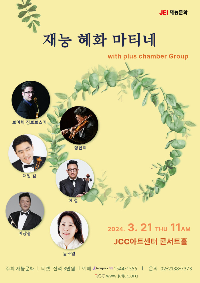 [시민일보 = 여영준 기자] 재능문화는 실력파 실내악 그룹 플러스챔버그룹(PLUS Chamber Group)의 재능 혜화 마티네 공연을 JCC 아트센터 콘서트홀에서 오는 21일 개최한다고 7일 밝혔다.