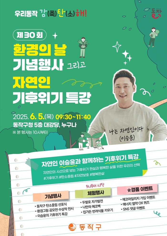 [시민일보 = 여영준 기자] 서울 동작구(구청장 박일하)가 제30회 환경의 날(6월5일)을 맞아 오는 6월5일 구청 5층 대강당에서 ‘환경의 날 행사’를 개최한다.