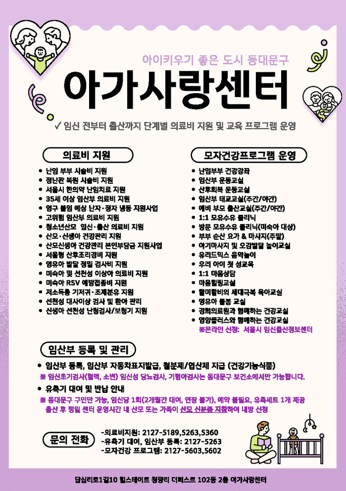 프로그램 신청·문의는 동대문구 아가사랑센터를 통해 안내받을 수 있다. 아가사랑센터는 청량리역 6번 출구 인근(서울 동대문구 답십리로1길 10, 2층)에 위치한 모자보건센터로, 임신·출산·육아 단계별 프로그램과 상담도 운영한다.