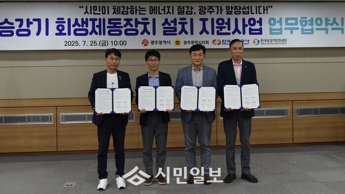 광주광역시(시장 강기정)는 광주광역시의회, 한국전력공사 광주전남본부, 한국승강기안전공단 호남지역본부와 함께 25일 시의회 대회의실에서 ‘승강기 회생제동장치 설치 지원사업 추진을 위한 업무협약’을 체결했다.