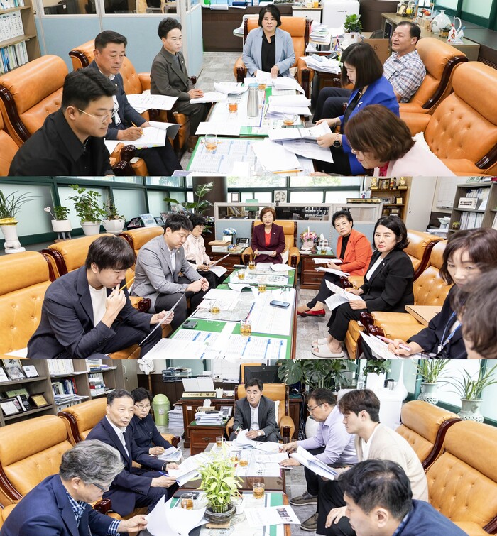 | 안산시의회 3개 상임위원회가 최근 제285회 임시회 안건 등을 논의하기 위한 시 집행부와의 간담회를 개최했다. 사진 위부터 기획행정위원회 문화복지위원회 도시환경위원의 간담회 모습. 사진제공=안산시의회 |