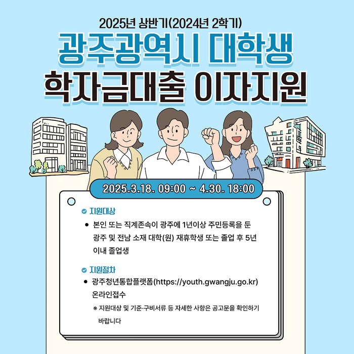 신청은 18일부터 다음 달 4월 30일까지 광주청년통합플랫폼을 통해 온라인으로 신청받는다. 학자금 대출 이자지원 신청에 대해 궁금한 사항은 광주시 대학인재정책과로 문의하면 된다.