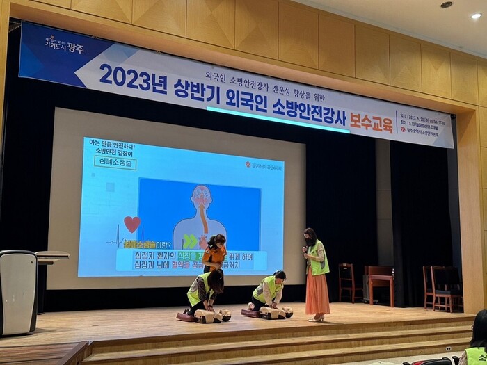 [광주=정찬남 기자] 광주광역시소방안전본부는 30일 5‧18기념문화센터 대동홀에서 외국인 소방안전강사 20명을 대상으로 보수교육을 진행했다.