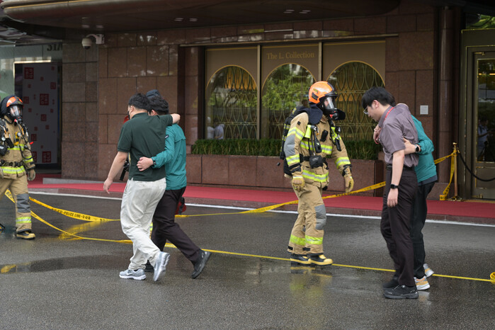 현장에 설치된 대형화면에는 훈련 상황이 실시간 중계됐다. 훈련은 ‘테러범이 드론을 이용해 롯데호텔을 공격하고 화재가 발생한 상황’을 가정했다. 호텔 상공에 미확인 비행물체가 접근한다는 상황이 전파됐고, 불과 몇 초 만에 드론이 호텔 외벽에 충돌해 폭발하며 흰 연기가 치솟았다.